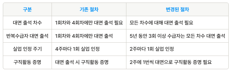 또한, 1~3회 차의 실업 인정 주기도 기존 4주에서 2주로 줄어들어, 반복수급자는 2주에 1번씩 대면으로 구직활동을 증명해야 실업급여를 받을 수 있습니다. 이러한 변화는 실업급여 수급자의 구직활동을 더욱 철저히 관리하기 위한 조치입니다.