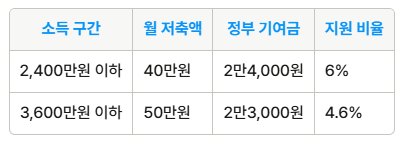 예를 들어, 소득이 2,400만 원인 사람이 50만 원을 저축하면 기존 6% 매칭 비율이 최대 40만 원까지 적용되어 24,000원의 보조금을 받고, 추가로 저축한 10만 원에 대해서는 3% 또는 3,000원이 적용됩니다.