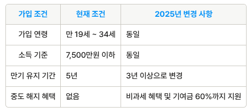 만 19~34세 청년이며 개인소득 7500만원 이하 기준 중위소득 250% 이하여야 가입할 수 있습니다. 현재는 정부 보조금과 비과세 혜택을 받으려면 5년간 유지해야 하지만, 2025년부터는 3년 이상 유지하면 조기 해지 시에도 비과세 혜택을 받을 수 있습니다. 또한 하반기부터는 원금의 최대 40%까지 일부 인출할 수 있는 기능이 추가됩니다.