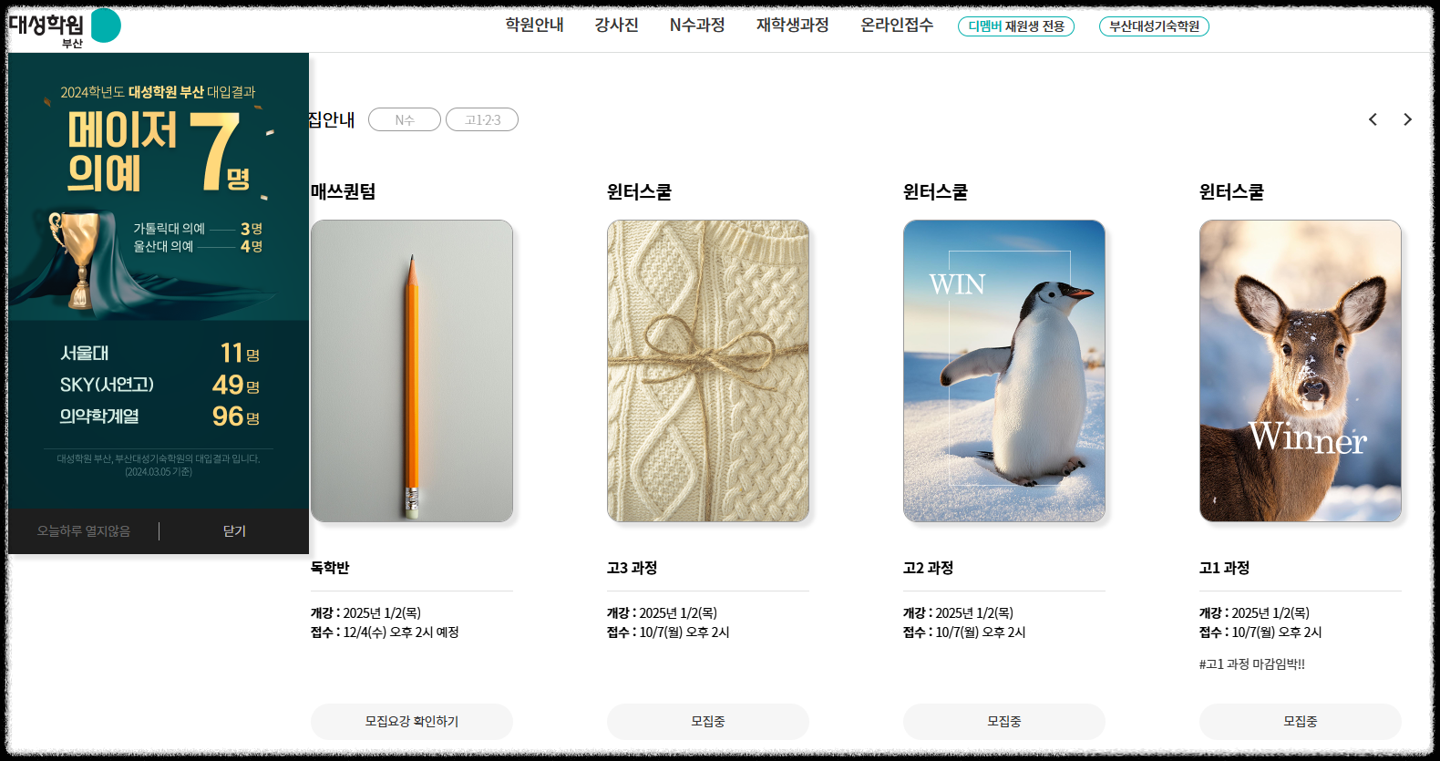 ○ 프로그램 : 기숙 생활을 통해 24시간 학습 지원이 이루어지며, 정기적인 모의고사와 피드백 시스템이 마련되어 있습니다..