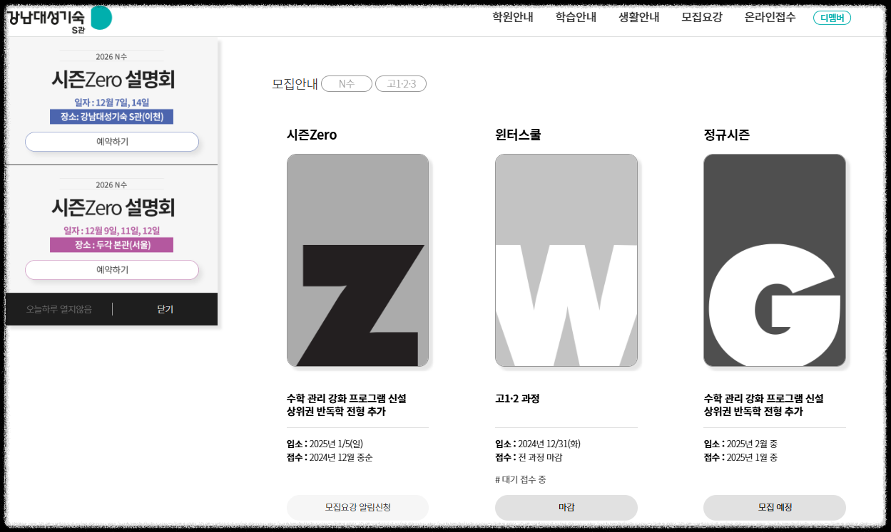 ○ 프로그램 : 정규 수업 외에도 자습 지원, 주간 테스트, 개별 상담 프로그램이 마련되어 있어 학생들이 자신의 학습 진도를 점검하고 보완할 수 있습니다..