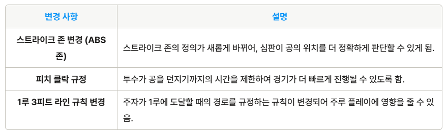 시범경기에서는 2025 시즌에 적용될 새로운 규정과 규칙이 모두 적용됩니다. 변경된 스트라이크 존(ABS존)과 피치클락 규정이 도입되며, 1루 3피트 라인 규칙이 변경됩니다.