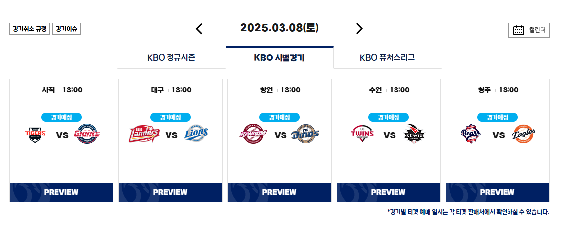 2025년 KBO시범경기가 3월 8일(토)부터 18일(화)까지 집행됩니다. 각 구단은 10 경기를 치르며 총 50경기가 예정되어 있습니다.