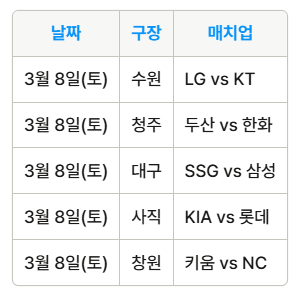 | 3 | 8 | 토 | LG-KT | 두산-한화 (청주) |