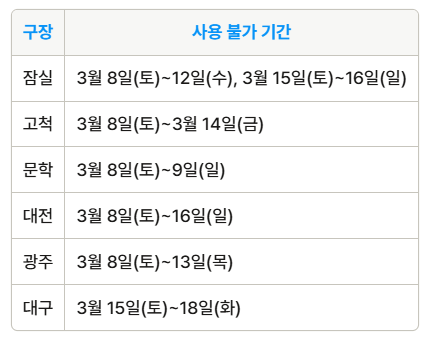 사용불가 구장 및 기간