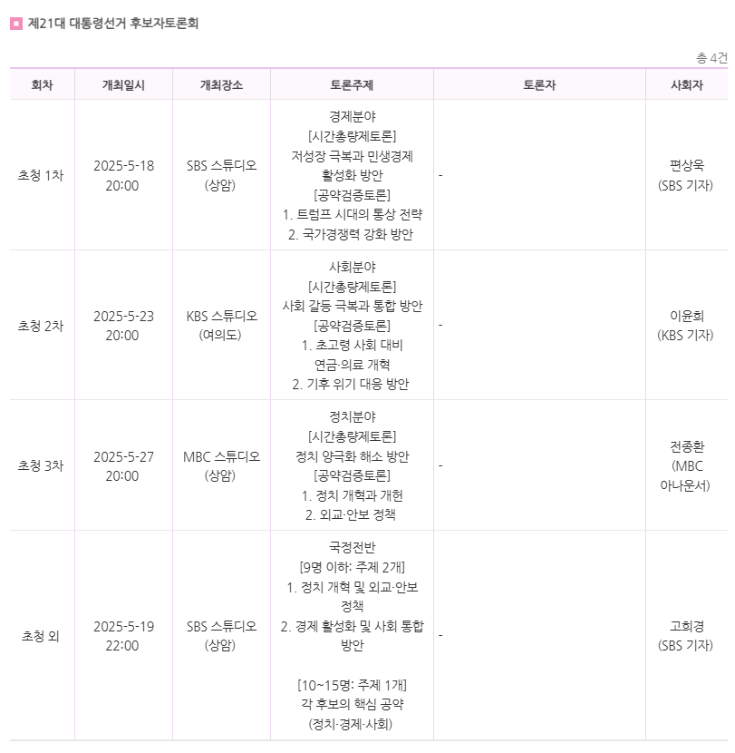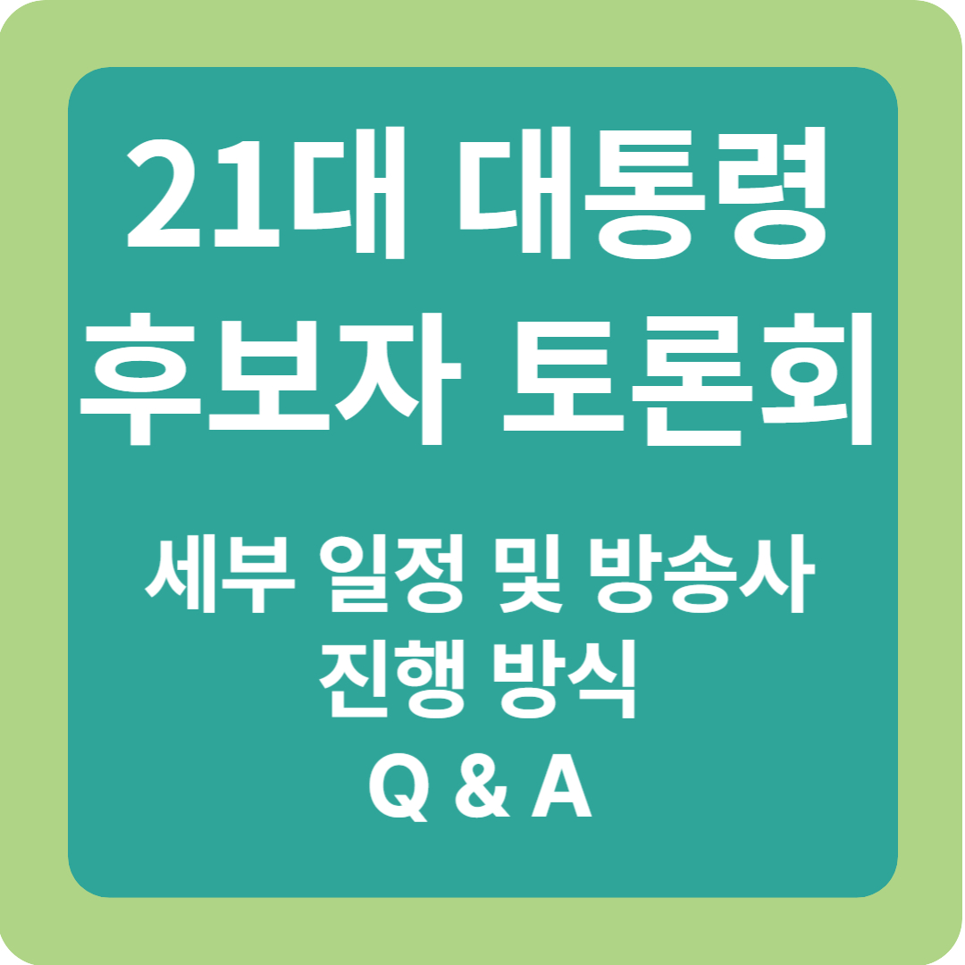 드디어 제21대 대통령선거 후보자토론회가 5월부터 본격적으로 시작됩니다. 후보자들의 정책과 철학, 비전을 직접 비교하고 평가할 수 있는 이 소중한 기회를 놓치지 마세요. 지금 이 글에서 각 토론 일정, 토론 방식, 주요 방송정보까지 한눈에 확인하실 수 있습니다.